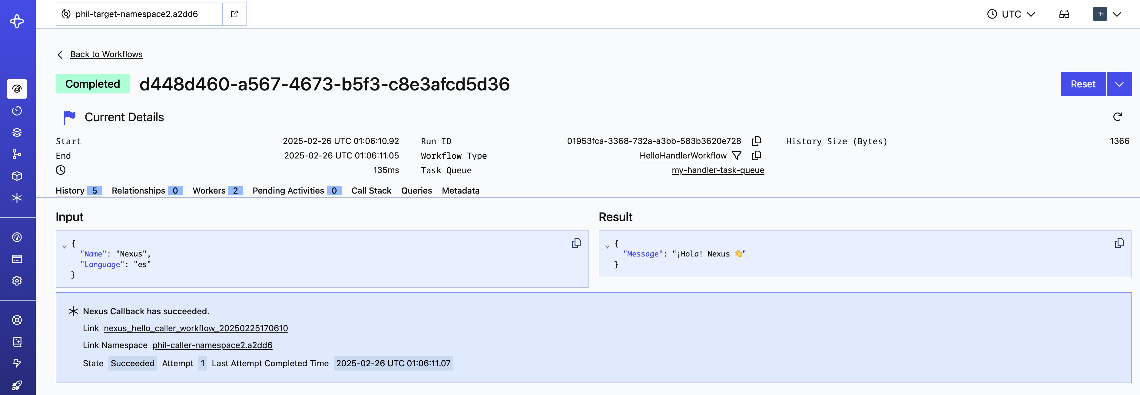 - To a Nexus Operation event in the caller's Workflow history.